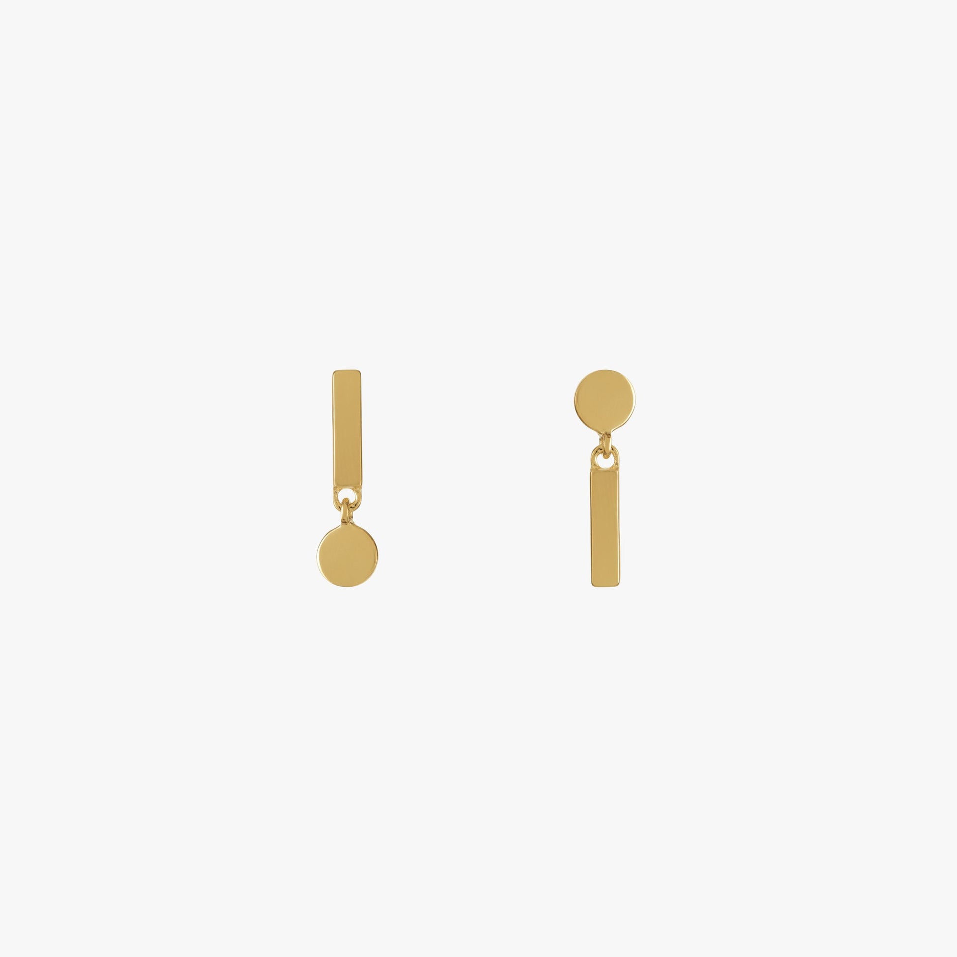 These mismatched geometric earrings have been artfully crafted using the brand's signature hand-carving wax technique. Cast from gold plated silver, one is shaped like a simple circle and rectangle drop while the other is reversed with a drop and a circle at the end. This contrasting pair adds a unique sophisticated edge to your ears. The two shapes hang independently of each other so catch the light beautifully in motion with your movements. Designed in London and come in a pristine white Buff branded jewellery gift box, ready for gifting.