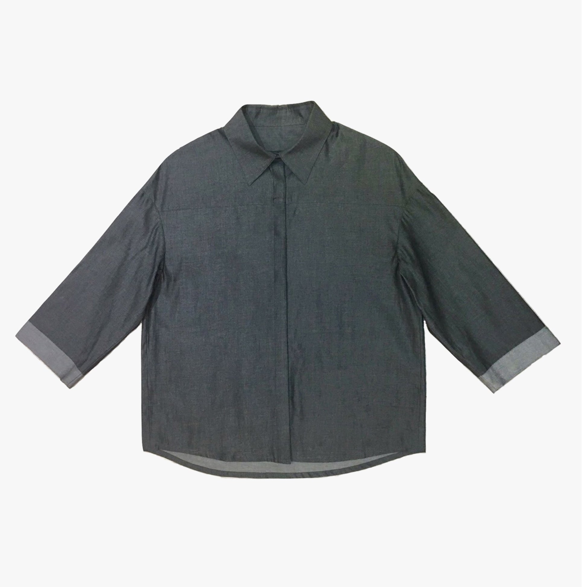 Inspired by architecture and Japanese aesthetics, this oversized shirt is made from coated cotton which has a crisp glossy finish. The shirt has hidden buttons all the way down the front and fold detail on the sleeves. Take a size down if prefer to wear it as a standard fit shirt. Pair it with matching trousers or jeans. The model is 176cm tall and wears size 8. Designed by AV London.