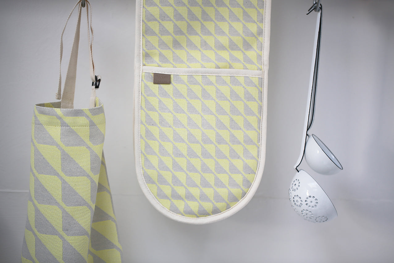 Every chef and kitchen need a pair of stylish double oven gloves. These are crafted in England from 100% jacquard cotton, featuring a custom textile design that cannot be found anywhere else. The gloves are protected with a heat resistant cotton layer, made to be used everyday, and are easy to wash. The minimal colour palette will match any interior and our Shoreditch Tea Towel. Designed by Mynn London.