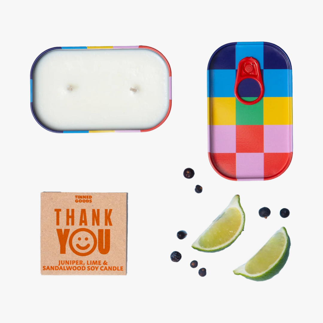 Show your gratitude and raise a smile with this graphic and unique candle design. With indulgent undertones of juniper, lime and sandalwood with added noted of fig this sophisticated delight will make a meaningful gift expressing your appreciation. Crafted from high quality soy wax with two cotton wicks for a clean and even burn. The design is inspired by bold graphics of traditional European delicatessen, aka sardine, tins and the nostalgia of vintage American tobacconists. Once used, this tin can be cleaned and repurposed. Created and hand-poured by Block Design in Cornwall.