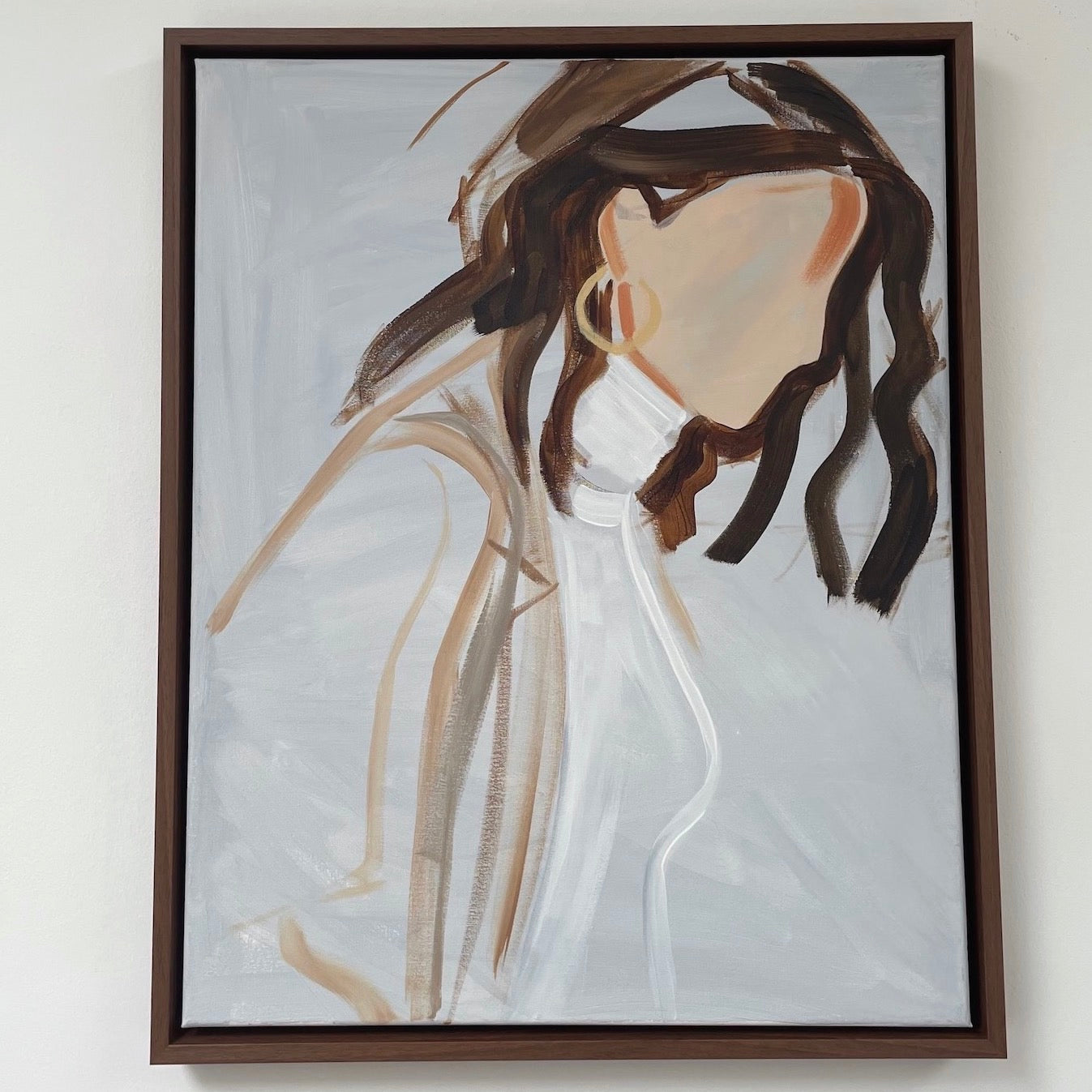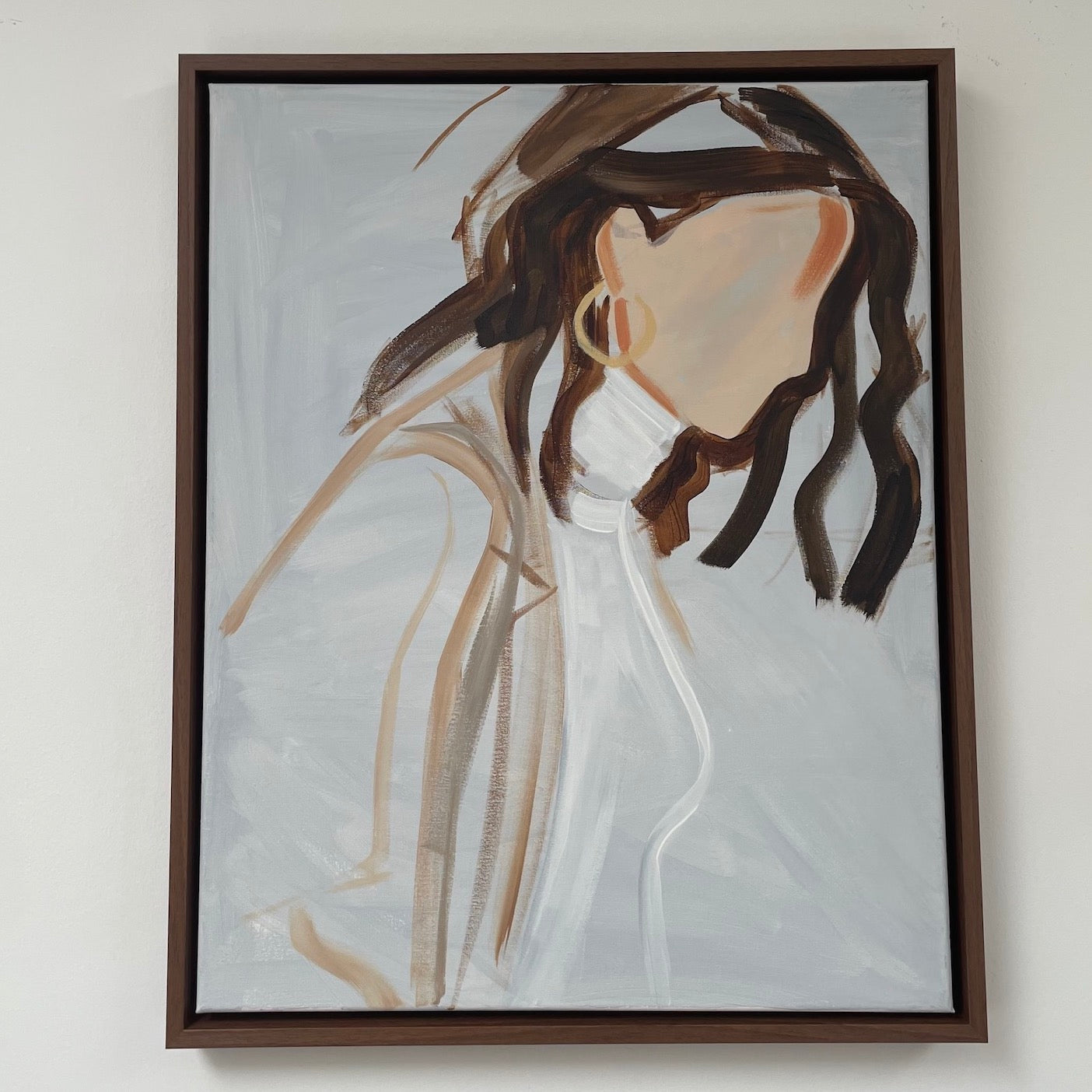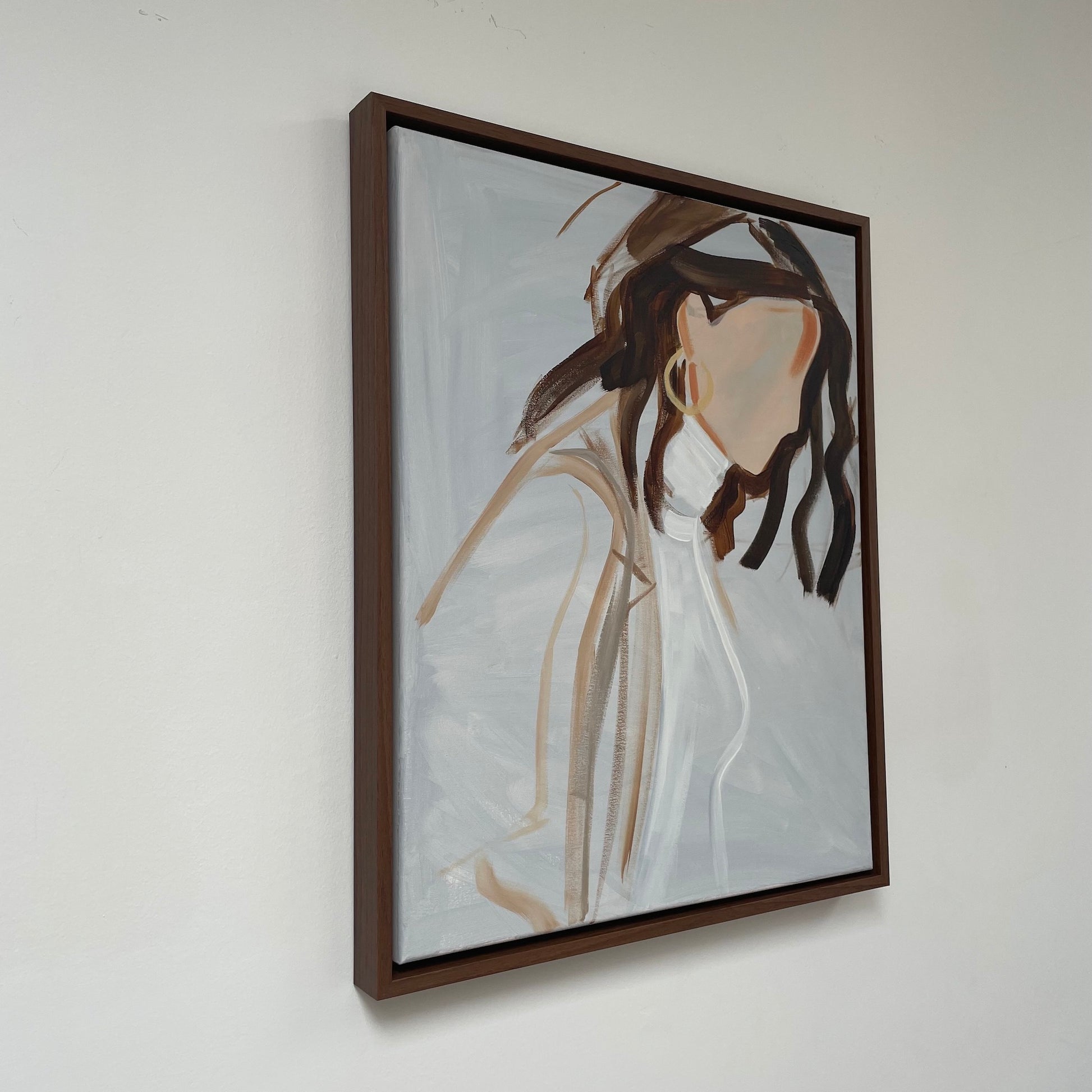 This fine artwork captures the essence of a female impression evoking a profound feeling of ease, grace and empowerment; leaving room for personal interpretation. Painted in acrylics on canvas, with an emphasis on lines to create movement and loose brushstrokes to create energy. The artwork is signed and comes in dark brown floating frame. Created by Elise Mendelle.