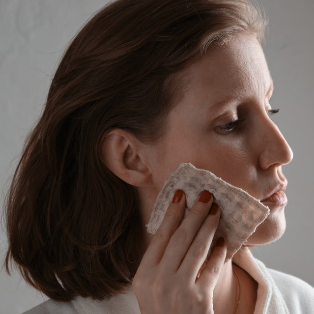 Ethically handcrafted from durable organic cotton, these large face care and makeup removal pads are a perfect replacement for disposable cotton wool ones. The waffle texture pads are soft and gentle on the skin, made from leftover fabric of waffle towel production. A design-led alternative to many disposable pads featuring good absorbency and produced with respect for the land, the animals and the workers. Created for everyday use. Rinse with soapy water or pop them into the washing machine with your usual load. Comes in a box, ready for gifting. Each box contains two oval and two square pads. Designed by Danish The Organic Company.